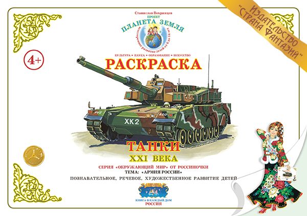Книжка-раскраска содержит яркие предметные иллюстрации на тему «Танки XXI века».